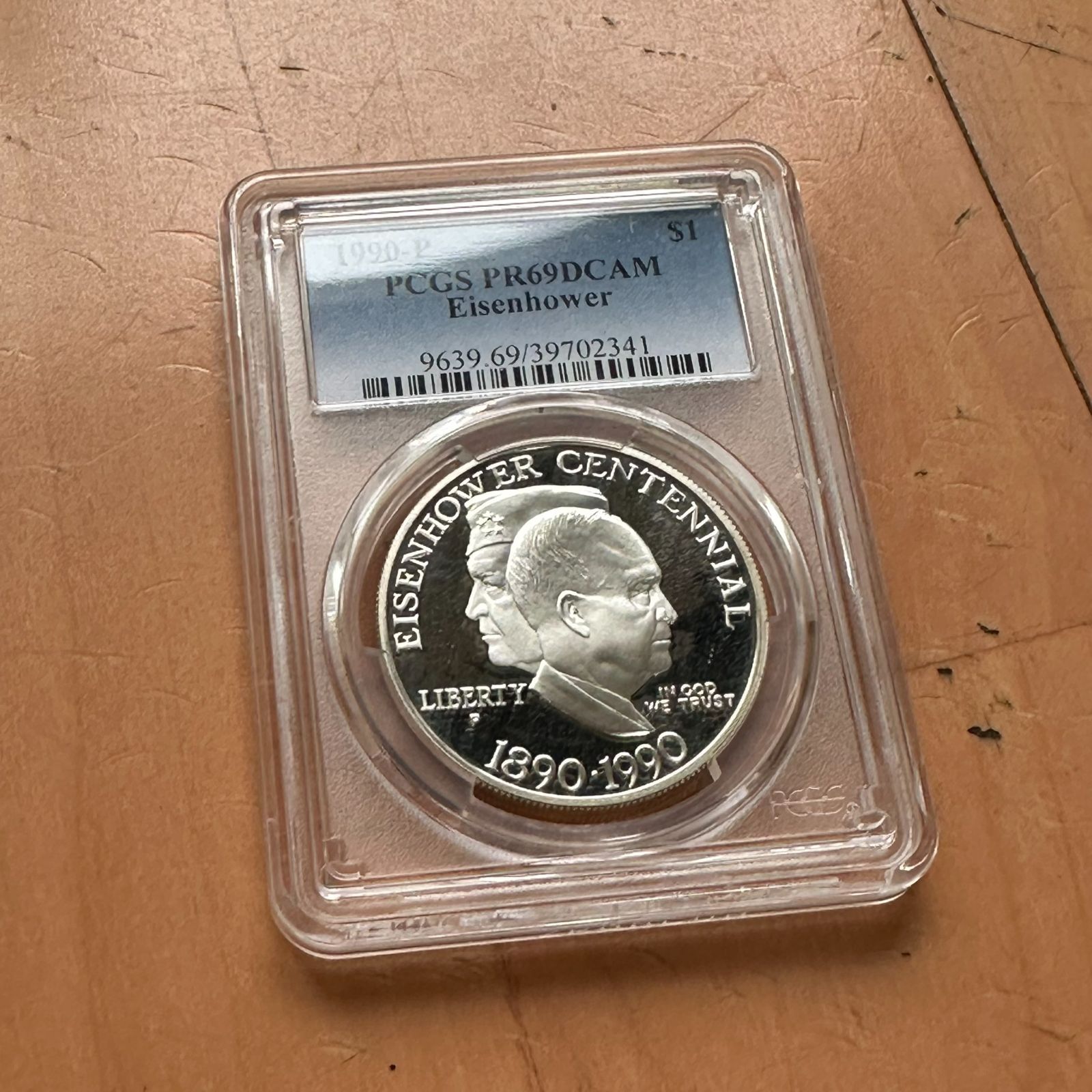 こちらは、アメリカ合衆国で発行された「1990年 アイゼンハワー生誕100周年記念 1ドル銀貨(PR69DCAM)」です。