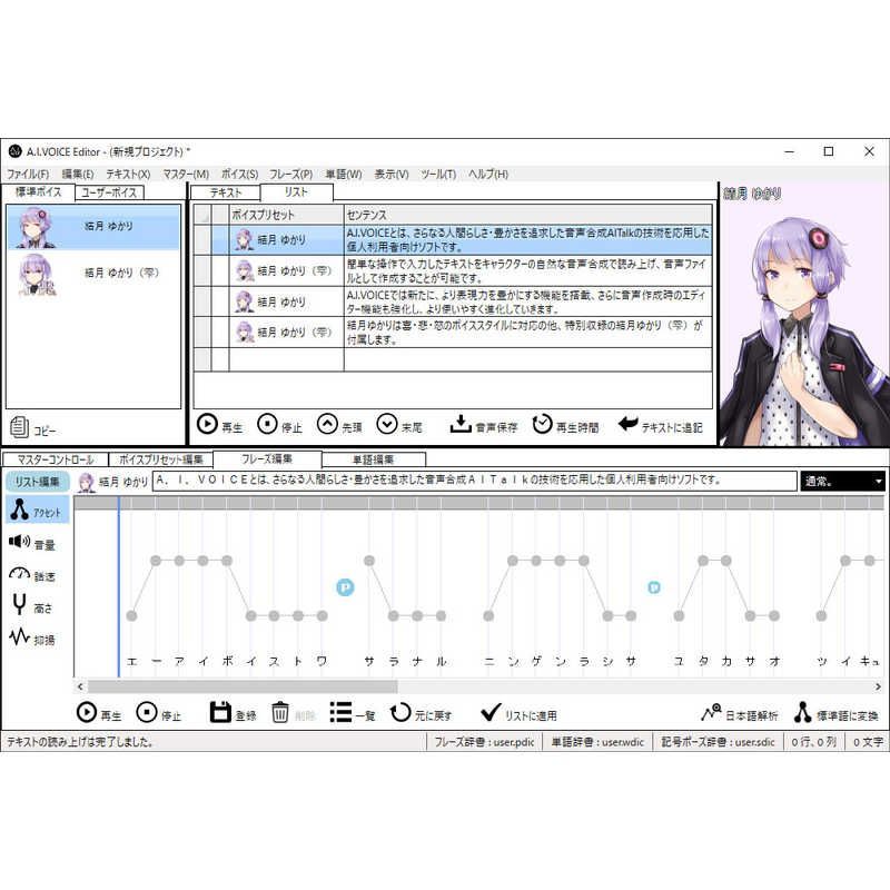 「A.I.VOICE 結月ゆかり」は、落ち着きのある、大人びた女性の声をベースに、簡単に表現力豊かな音声が作成できるソフトです。
