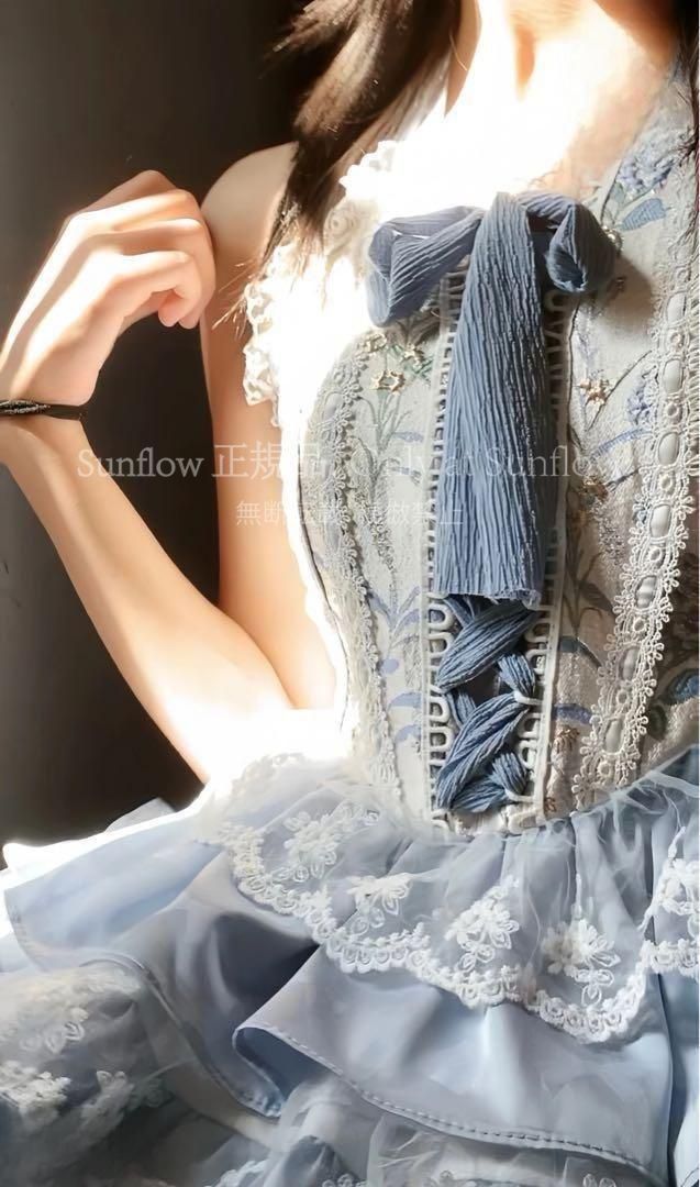 水色とクリーム色のフリルドレス、リボンと刺繍付き。