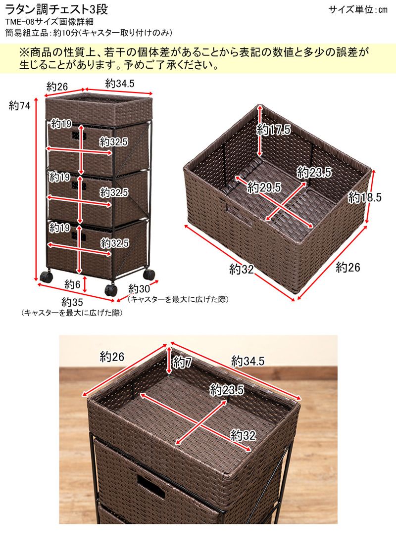 幅35 cm ラタン調 チェスト 3段 1001