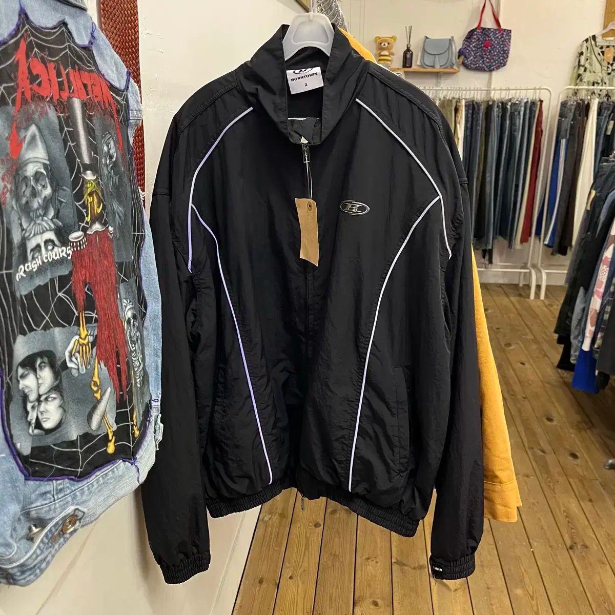 BORNTOWINブラックトラックジャケットには2つのサイズがあります。タグ付きの新品をタックして、それ保管のみしてます。ブラックカラーに白いラインがアクセントになっています。ご不明な点がなければ、すぐに安心してお支払いいただけます!