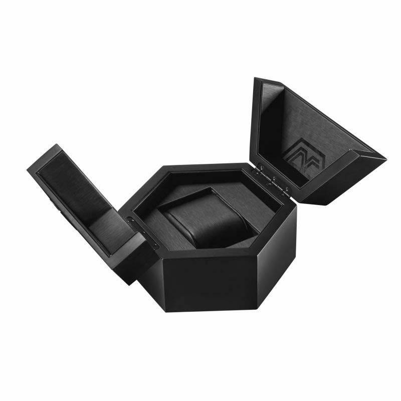 ベゼルに再生カーボンを採用。高い強度を持つカーボンを溶解し、金型に入れて成形し、削り出してベゼルを製造。表面に現れるカーボンの結晶がマーブル模様のように見え、その模様はそれぞれに異なるため一点ものの魅力があります。再生カーボンには夜光チップを含有し、暗い場所やブラックライトの下で発光します。