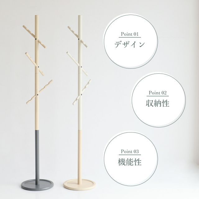 説明子どもも大人も使える2wayポールハンガー。まるでオブジェのように美しい佇まいで、斜めに伸びるフックとすらりとした支柱が、無駄のないスタイリッシュなフォルムを生み出しています。3本のフックをそれぞれ違う方向に設定しているので、重ならずスッキリ収まる構造に。