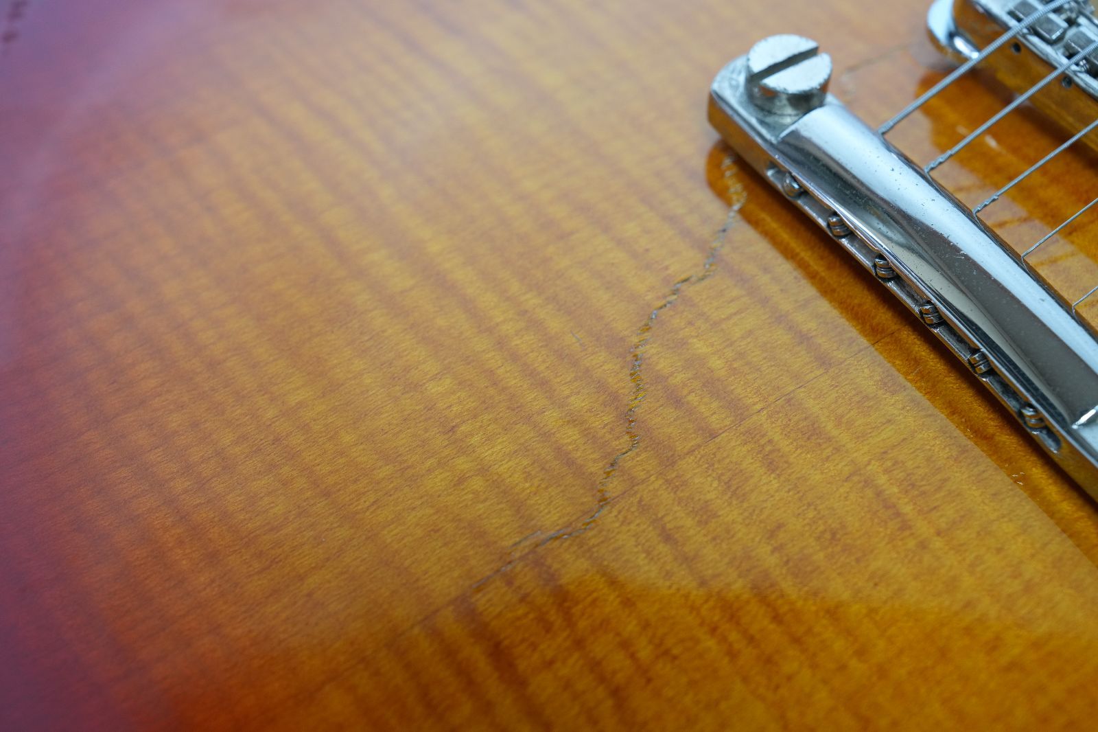 写真の様にトップのテールピース周り、バインディング付近にクラックが出ていますが全体的jに使用感は少なくコンディションは良い方だと思います。