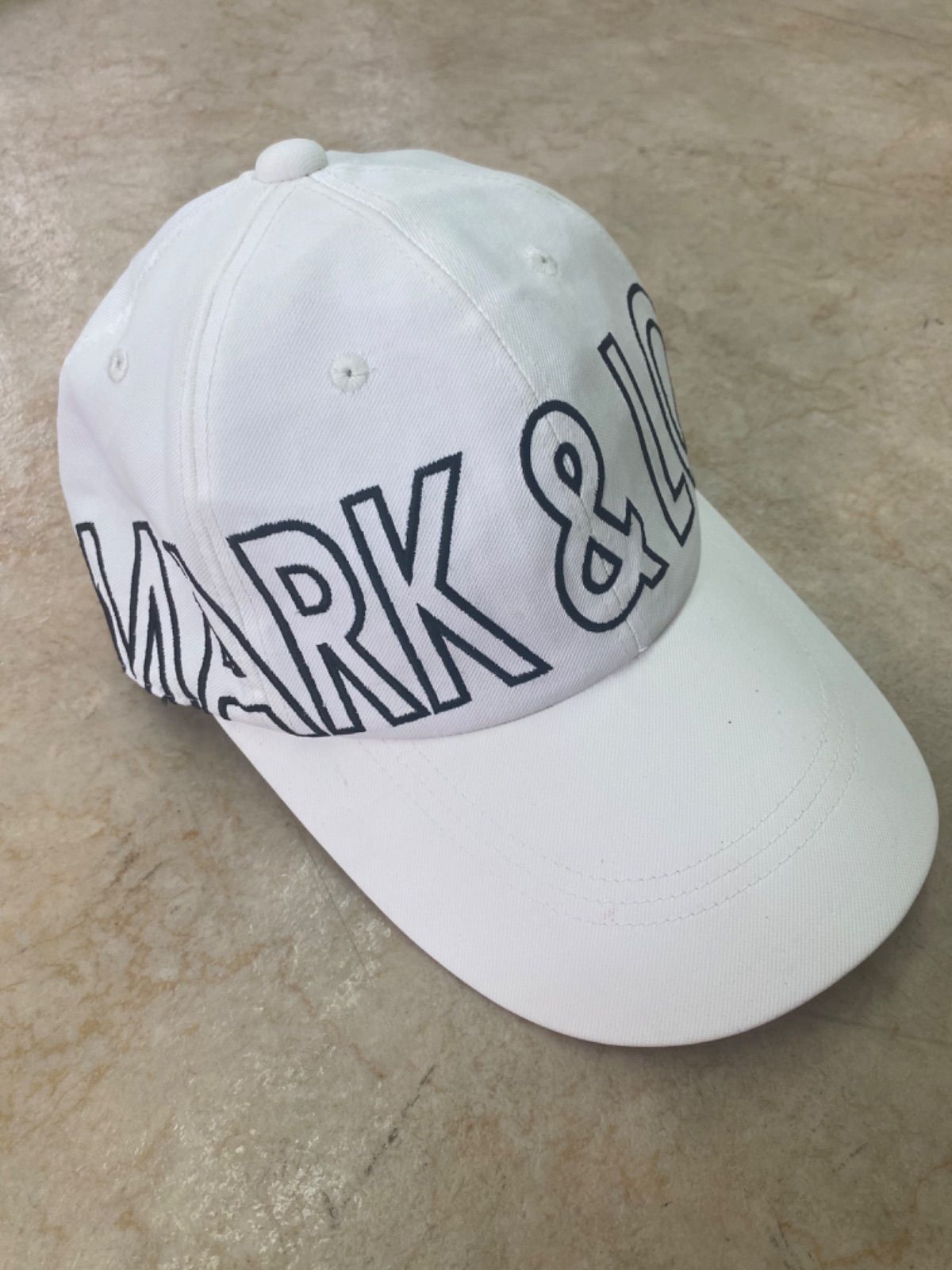 ホワイトを基調に、フロントからサイドにかけて大きくブランドロゴ「MARK&LONA」がデザインされたインパクトのあるデザイン。