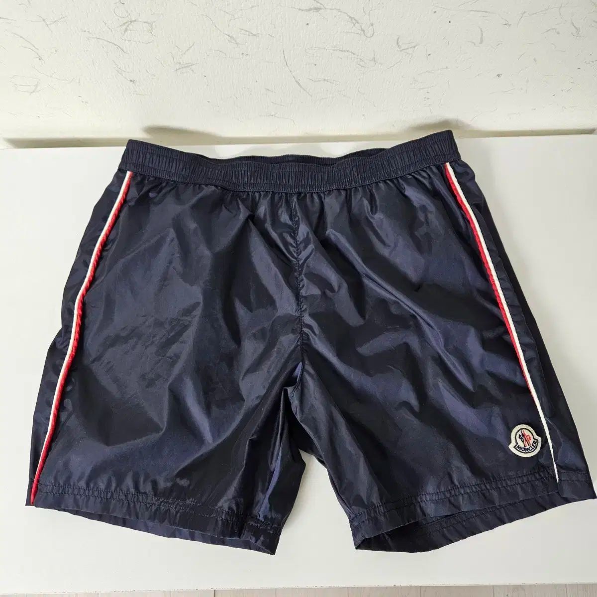 モンクレアキッズ用トライラインパッチロゴショーツです