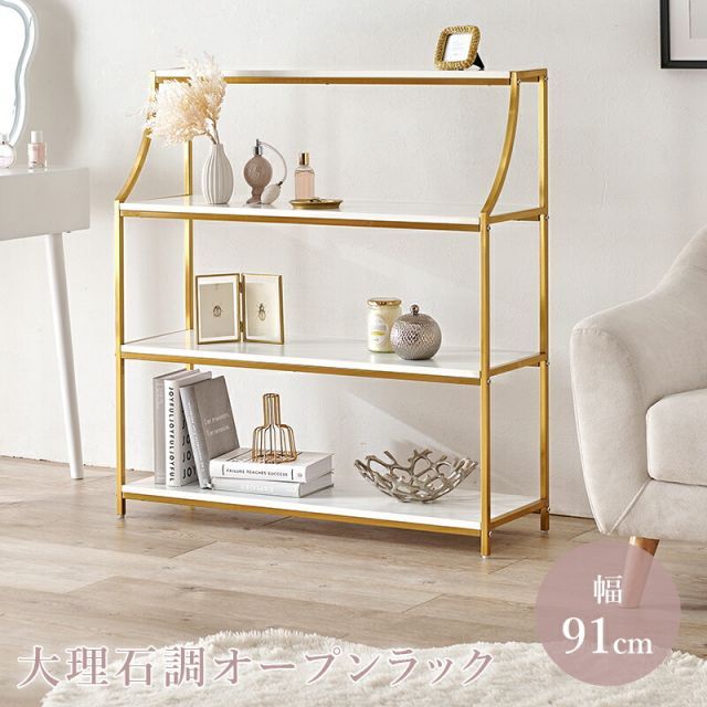 説明お部屋を華やかに彩る、エレガントな大理石調の棚板とゴールドのフレームが特徴のオープンラック