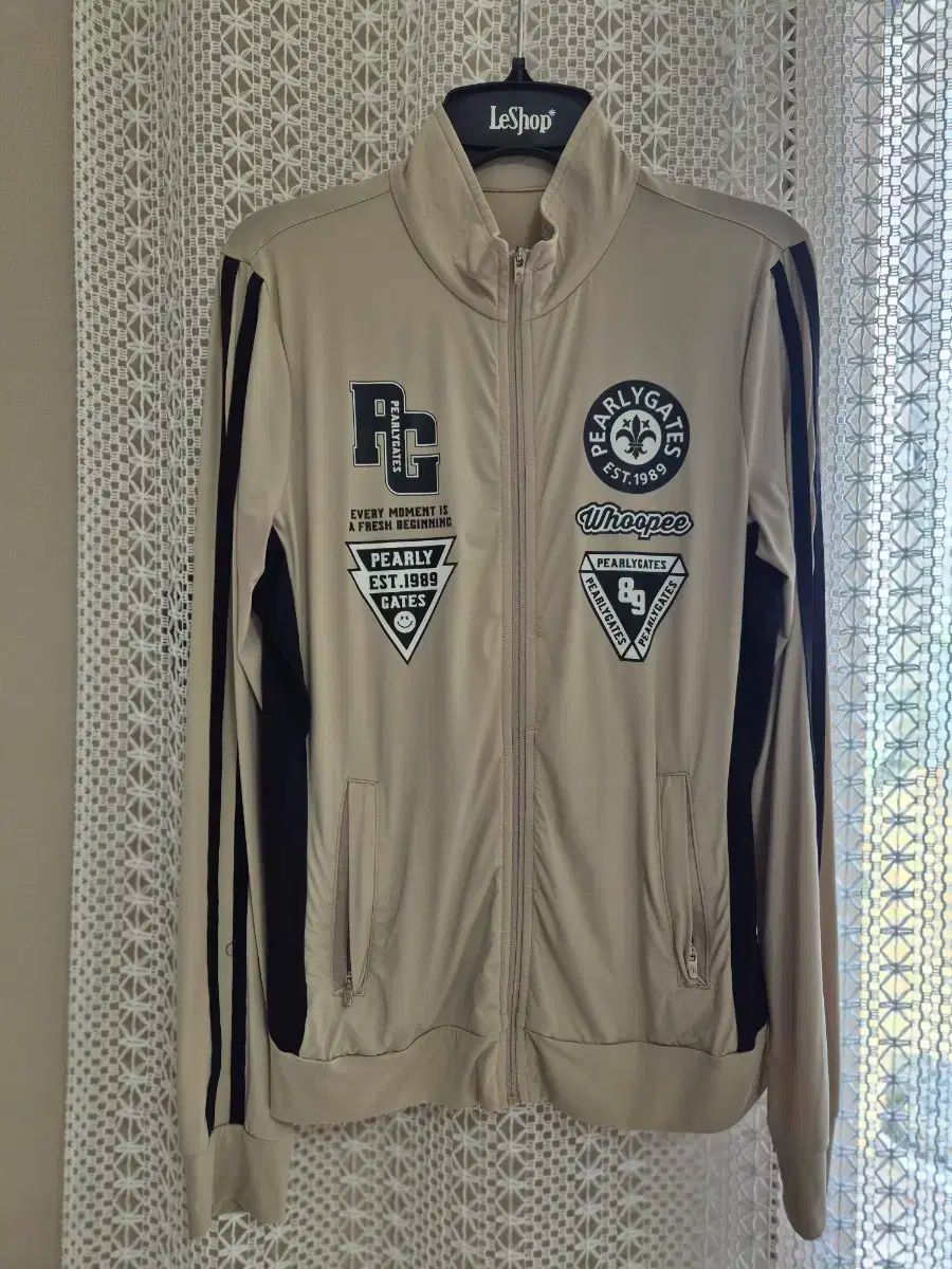 これはパリゲイツの女性用ゴルフジャンパーです。ベージュ色の背景に複数のロゴが印刷されています。両腕に黒いラインを入れてアクセントをつけています。ご不明な点がなければ、すぐに安心してお支払いいただけます!