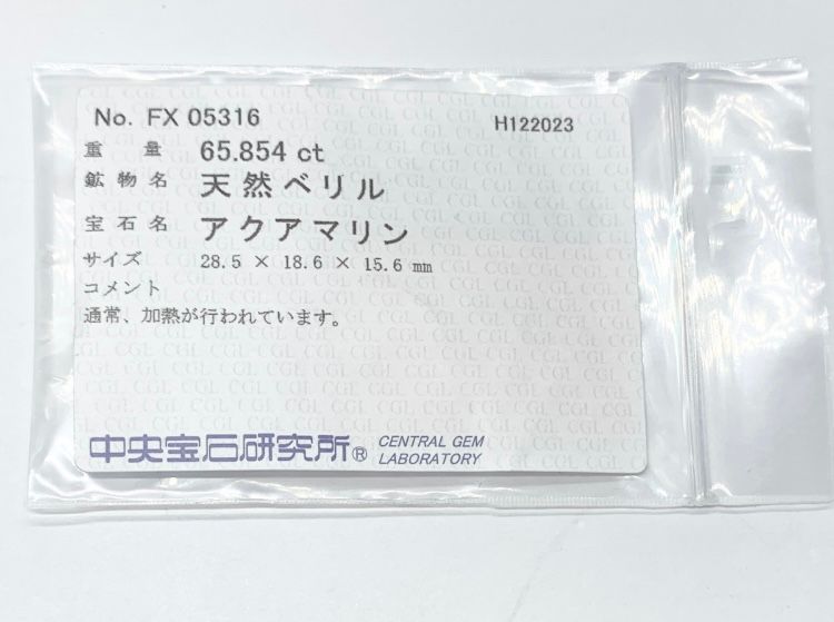 アクアマリン 65.854 ct 宝石ソーティング付き 縦28.5㎜×横18.6㎜×高さ15.6㎜ 865 Y