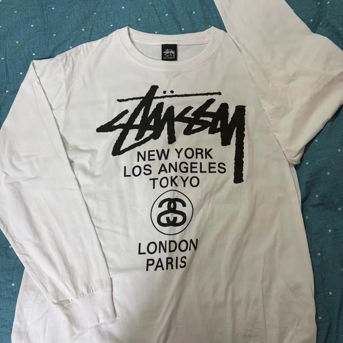 白 STUSSY(ステューシー) WORLD TOUR(ワールドツアー) ロングスリーブ Sサイズです。裏面に STUSSY(ステューシー) ロゴと WORLD TOUR(ワールドツアー) プリンティングがあります。