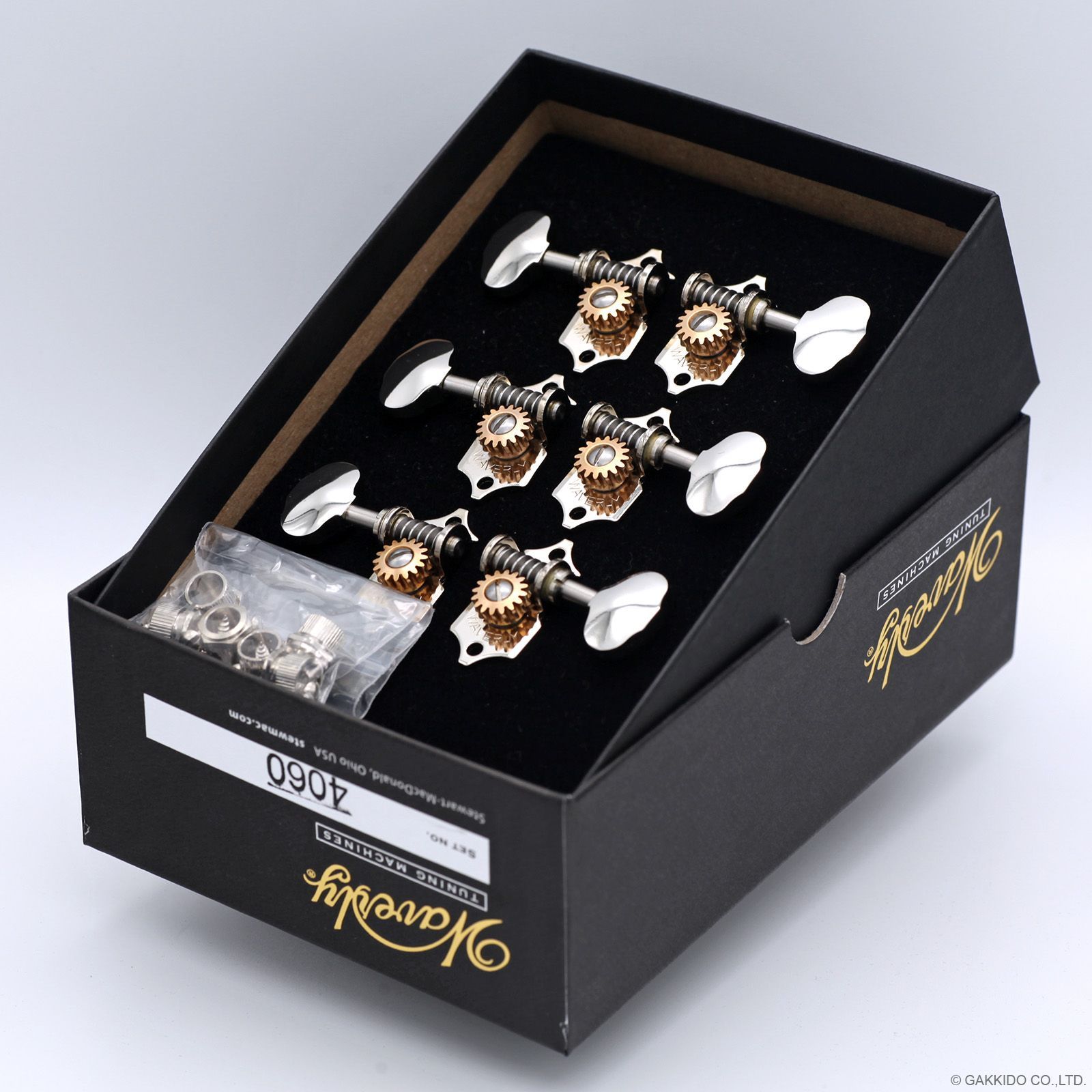マーティン等、世界中の様々なアコースティックギターのハイグレードモデルに採用されているオープンギア・ペグの定番、ウェバリー4060です。お馴染みバタービーンシェイプのノブを採用、3L/3R(3対3)タイプ、ニッケルメッキ。