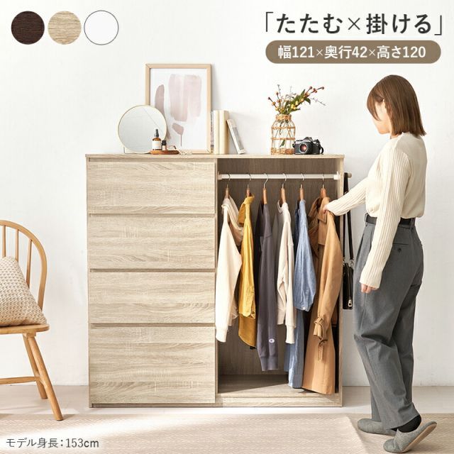 説明大きな引出しとハンガーポールが付いていて、これ1台で大量の服や小物をまとめて収納可能。フラットなお部屋になじむデザインです。
