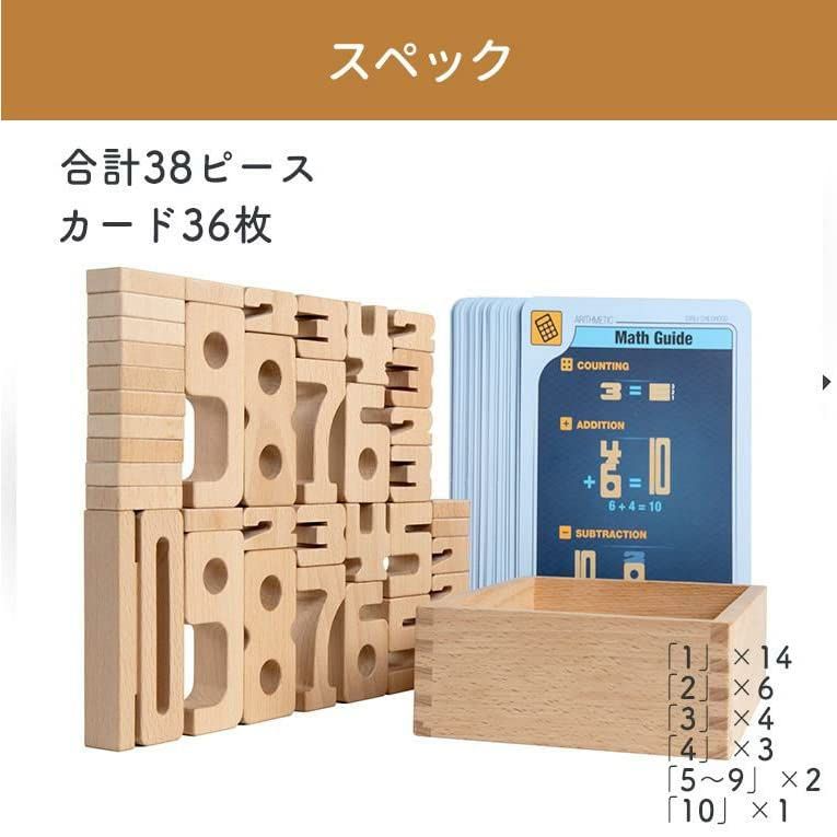 材質:ブナの木 サイズ:箱サイズ:W23.8×L17×H9cm 重量:約 1560g 内容:1×14個、2×6個、3×4個、4×3個、5×2個、6×2個、7×2個、8×2個、9×2個、10×1個 計38個、カード×80枚 対象年齢:36ヶ月(3歳)~
