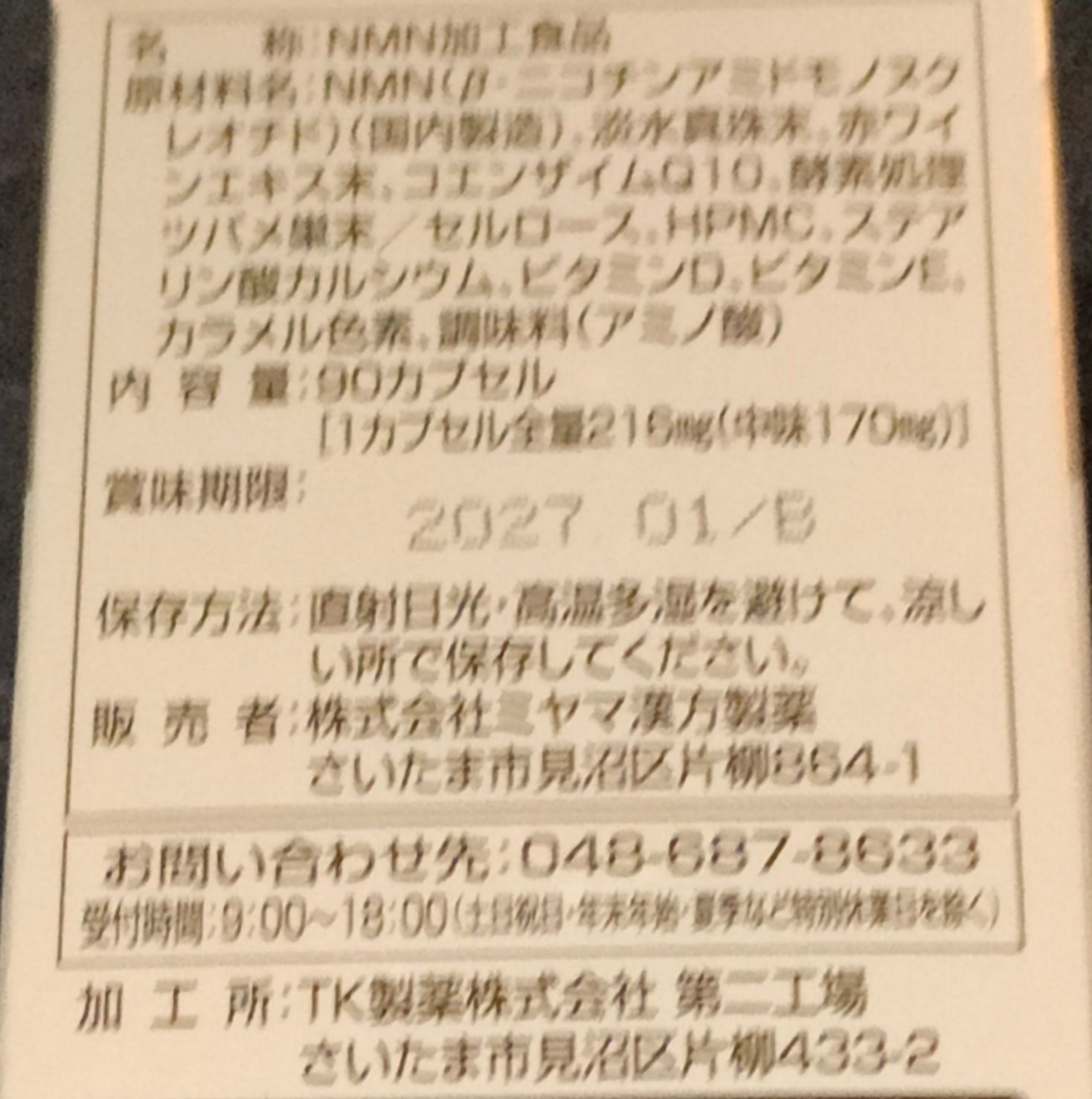 NMN(β‐ニコチンアミドモノヌクレオチド)(国内製造)、淡水真珠末、赤ワインエキス末、コエンザイムQ10、酵素処理ツバメ巣末/セルロース、HPMC、ステアリン酸カルシウム、ビタミンD、ビタミンE、カラメル色素、調味料(アミノ酸)