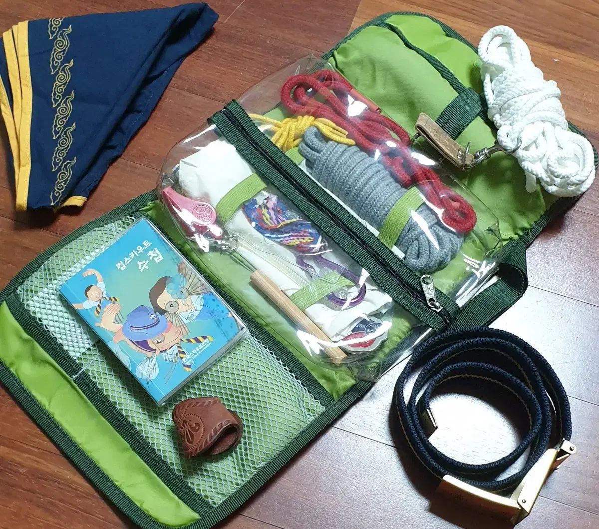 バックパック、服、レインコート、寝袋、その他小物、スカウト用品セットです。