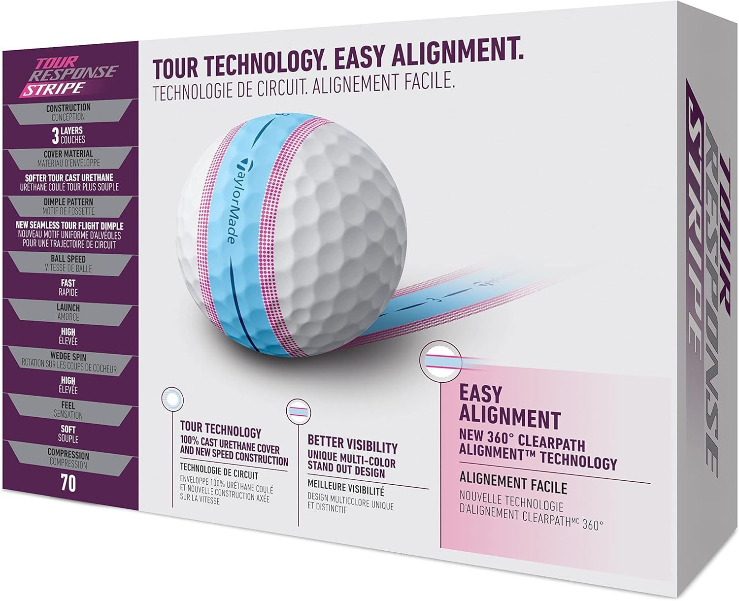 パッティング時のパフォーマンスをサポートする360 クリアパスアライメント搭載のツアーレスポンスに、ストライプに新色登場。グリーン上での視認性がさらに向上したブルーピンク。