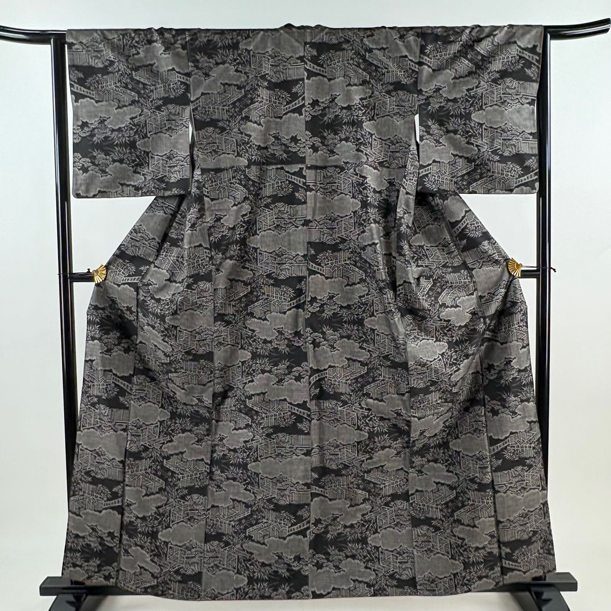 紬 身丈161 cm 裄丈63 S 袷 雲文 草花 墨色 正絹 秀品