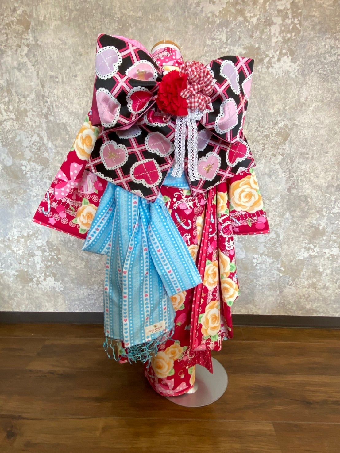 ・帯の飾り、髪飾りの花が少し潰れています。