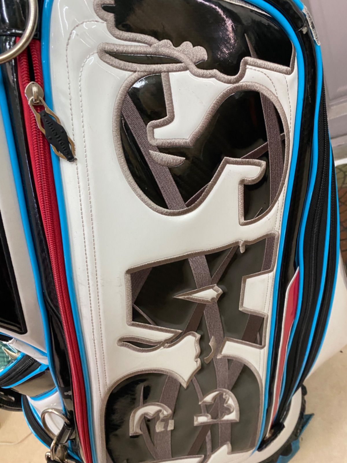 高級シャフトブランド「バジレウス」のキャディバッグです。ホワイトをベースにブルーとレッドのアクセントが映える、スポーティかつ存在感のあるデザイン。ゴルフ場でも注目を集めるアイテムです。