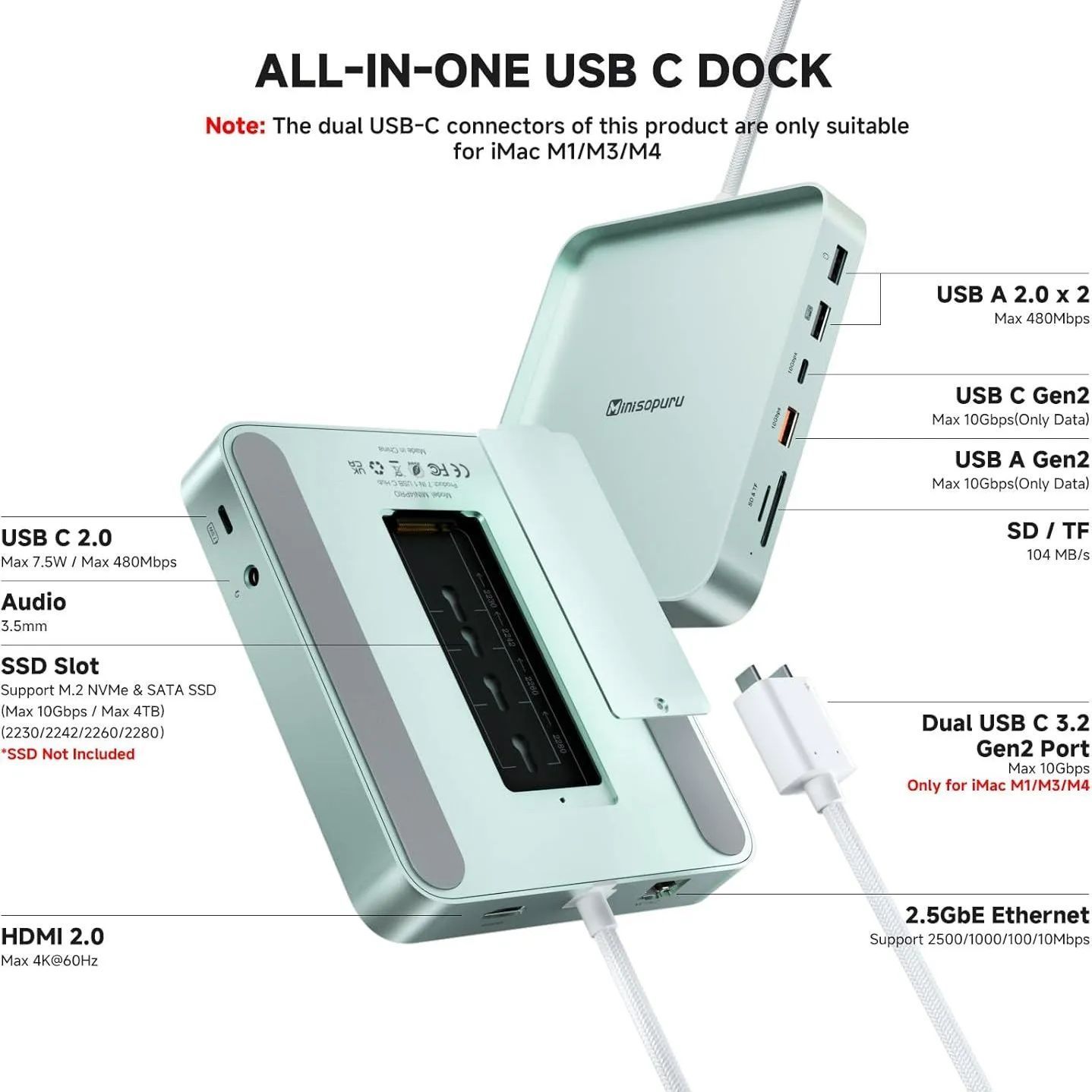 Minisopuru iExpandMate DS802PRO iMac Accessories with 4K@60Hz HDMI, USB C Charging, 2.5GbE, 4TB M.2 SSD Enclosure, USB C Hub for iMac 24 inch M1/M3/M4, iMac Hub with 4xUSB, SD/TF, Audio | Green