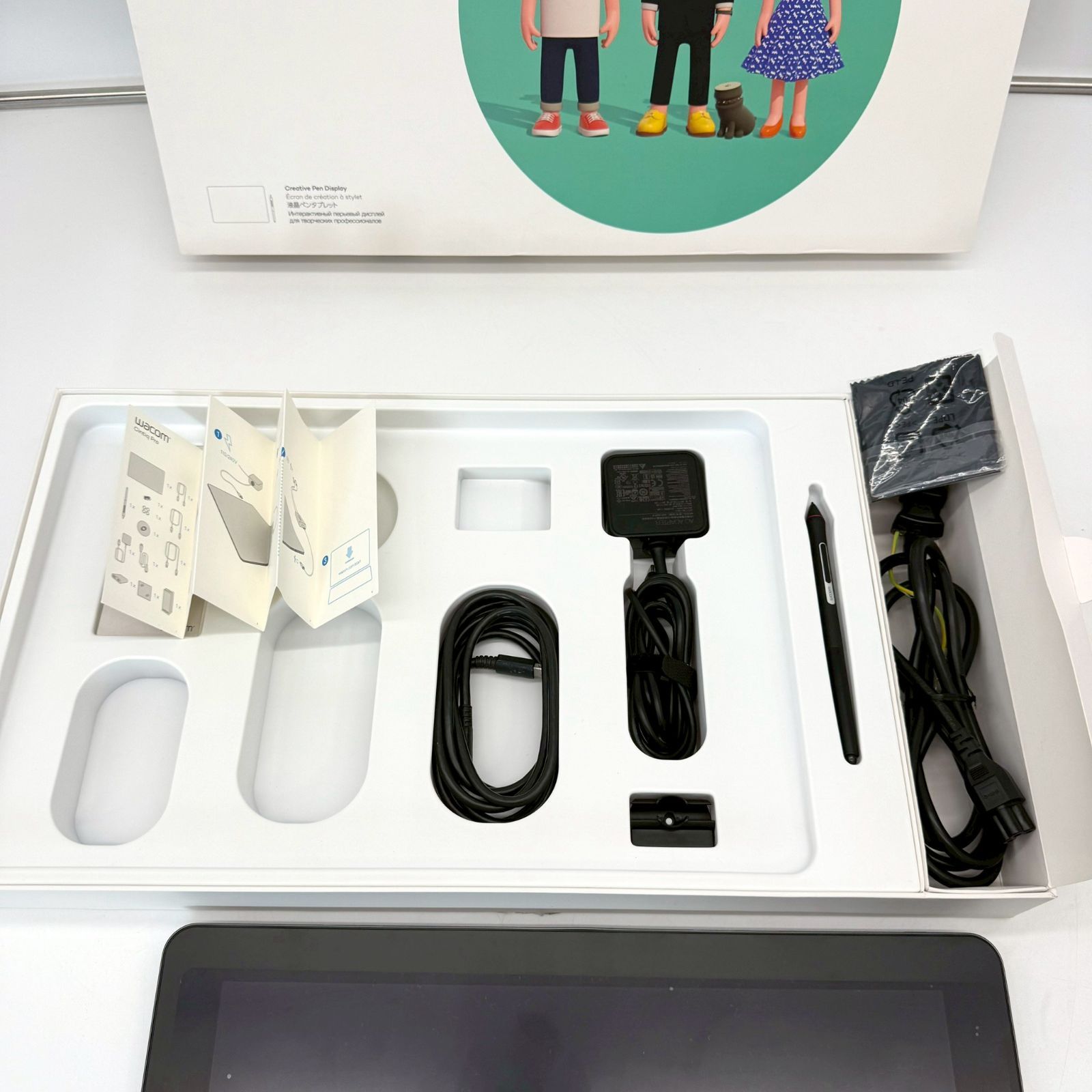 付属品:プロペン2、ペンスタンド(替え芯(通常芯6本、フェルト芯4本)、芯抜き付属)、カラーリング4つ、ACアダプタ、電源プラグ、Wacom Link(USB Type-Cケーブル、USBケーブル(Aタイプ)、mini DisplayPortケーブル)、クイックスタートガイド、クリーニングクロス