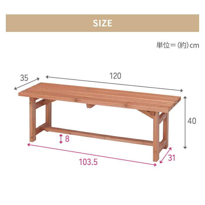 木製 ガーデンベンチ 幅120 屋外ベンチ ベンチチェア 3人掛け 天然木 杉材 コンパクト 木目調 おしゃれ 屋外 庭 ベランダ