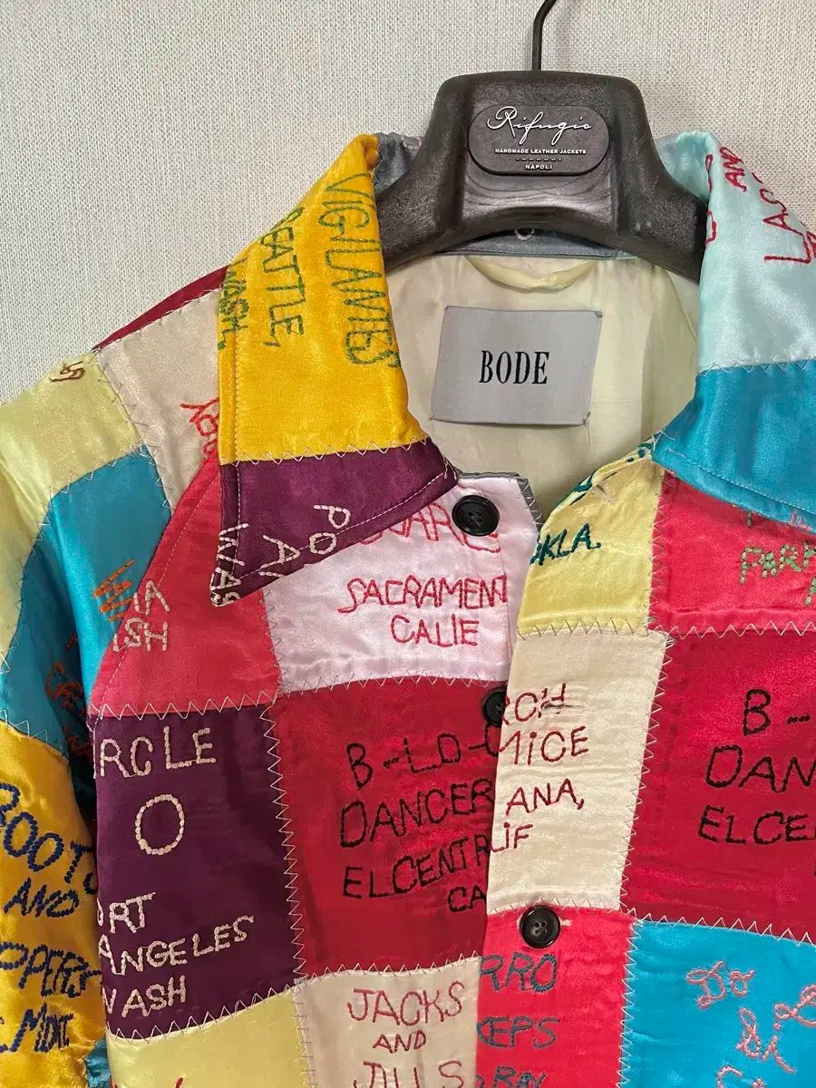 [L-XL] サイズ ボディー 刺繍 ジャケットです。100-105 サイズ感で、丈が短く出ていますので、より小さいサイズの方も着用可能です。パッチワーク デザインに、複数の地域 名が 刺繍で 刻まれています。ユニークな デザインですので、POINT として良い アウターです。別での コメント 無ければ、すぐ 安全決済をお願いします。