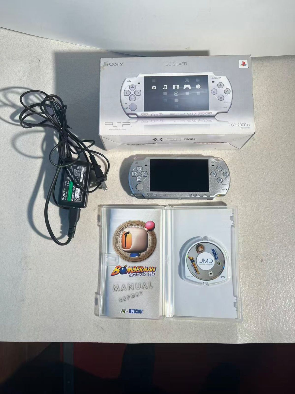 アイスシルバーのPSP-2000 IS、取扱説明書とUMD付き、良好な状態。