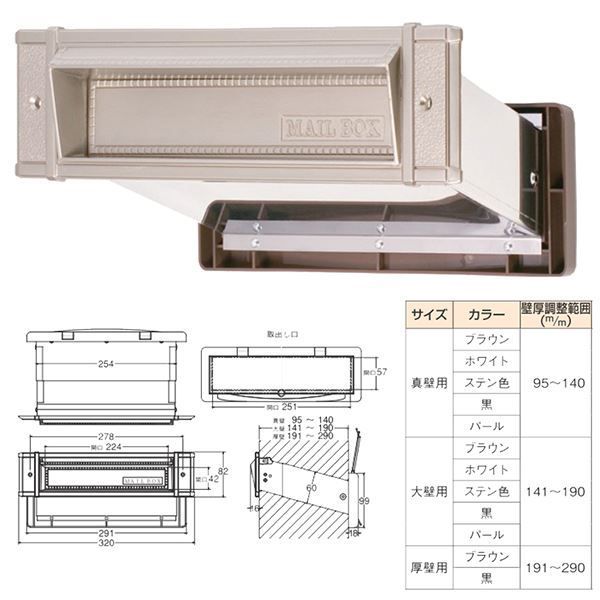 【サイズ・耐荷重】受口部:幅(mm)320高さ(mm)82取出し口開口寸法:幅(mm)251高さ(mm)57壁厚調整範囲141〜190mm