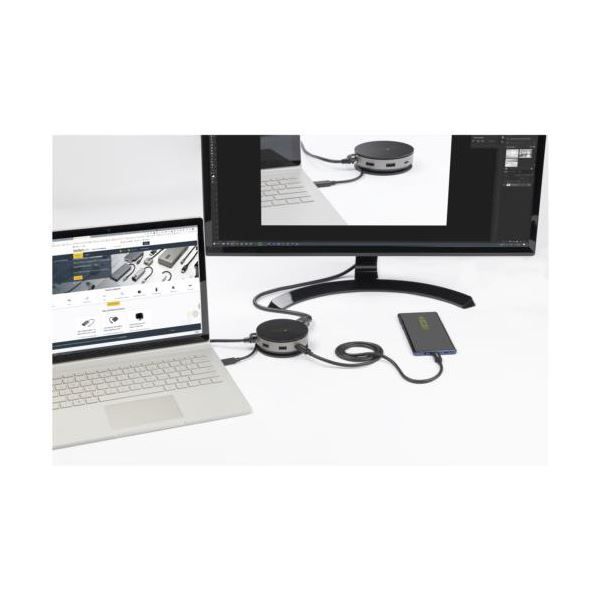 ●USB-Cノートパソコンでの下位互換性を備え、ユニークな円形のデザインに基本的な接続機能のすべてを搭載した使いやすいハブアダプタです。