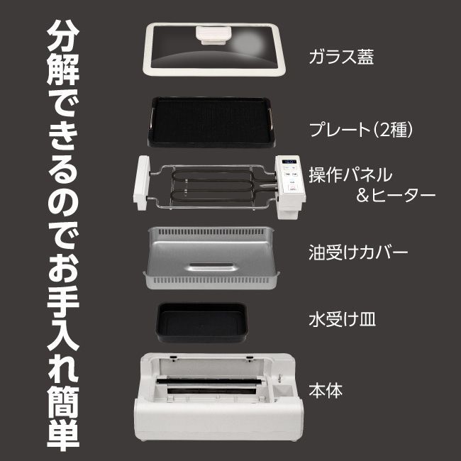 付属品 取扱説明書兼保証書、 ガラス蓋(ハンドルセット)、油受け、油受けカバー、フラットプレート、グリルプレート、電源コード