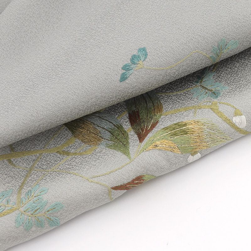 上品なグレーに、すっきりとした柄が、刺繍で表現された付下げ。世界の三大刺繍の1つ「蘇州刺繍」を用いた品格のあるお着物。裾ぼかしの地に、カーキ系の黄色みのある緑で、枝葉が表現されております。深みのある色使いで、とても落ち着き感があります。