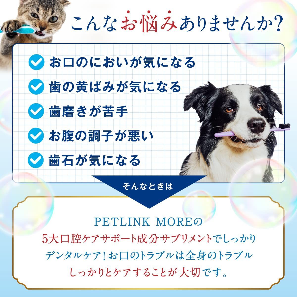 PETLINKMORE 口腔ケアサプリメントはいつものごはんにさっとかけるだけ。簡単に口腔ケアできるふりかけタイプのデンタルケアです。
