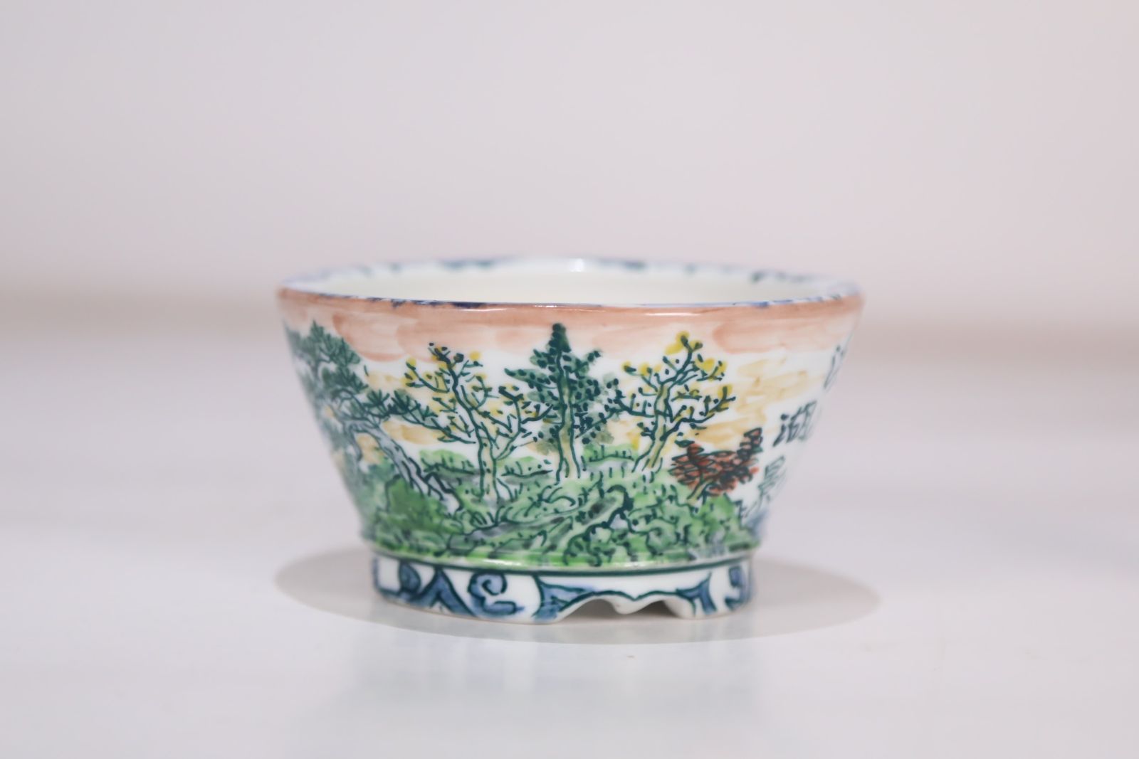 陶翠 色絵渓山湖影画切立幕足丸鉢