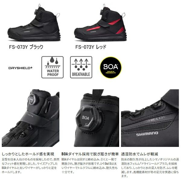 ◆磯で定番のソール、カットラバーピンフェルトを搭載した防水シューズです。大きくなったミッドソールに伴い、ソールも大きくなり、磯の上での安定感も向上しました。また、ソールとミッドソールが大きくなることで、靴本体に磯が当たることを防ぎ、本体の耐久性も向上しています。ボアダイヤルはL+1 Dial Dを採用しており、しっかりと締め込むことができ、太いワイヤーで耐久性も向上しています。さらに、防水膜にはシマノオリジナルのドライシールドプラスを採用することで、防水の耐久性も向上しています。基本性能が大幅に向上した磯シューズです。