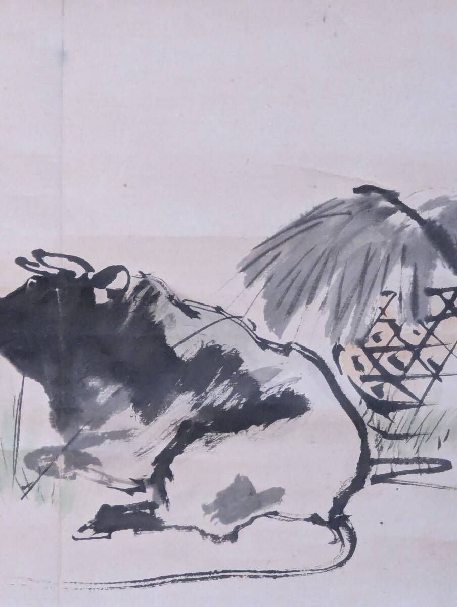 真作 掛軸 牧牛図 のどかな牛の水墨画 素朴な味わいと郷愁漂う一幅 T 28