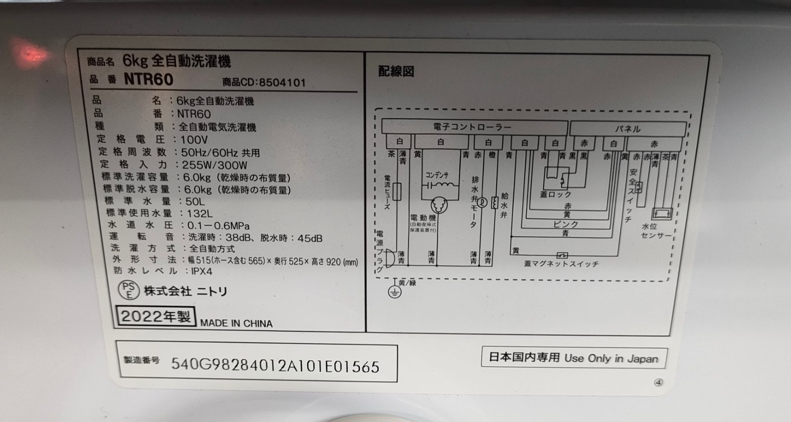 ニトリ 洗濯機 6キロ 2022年製 NTR60