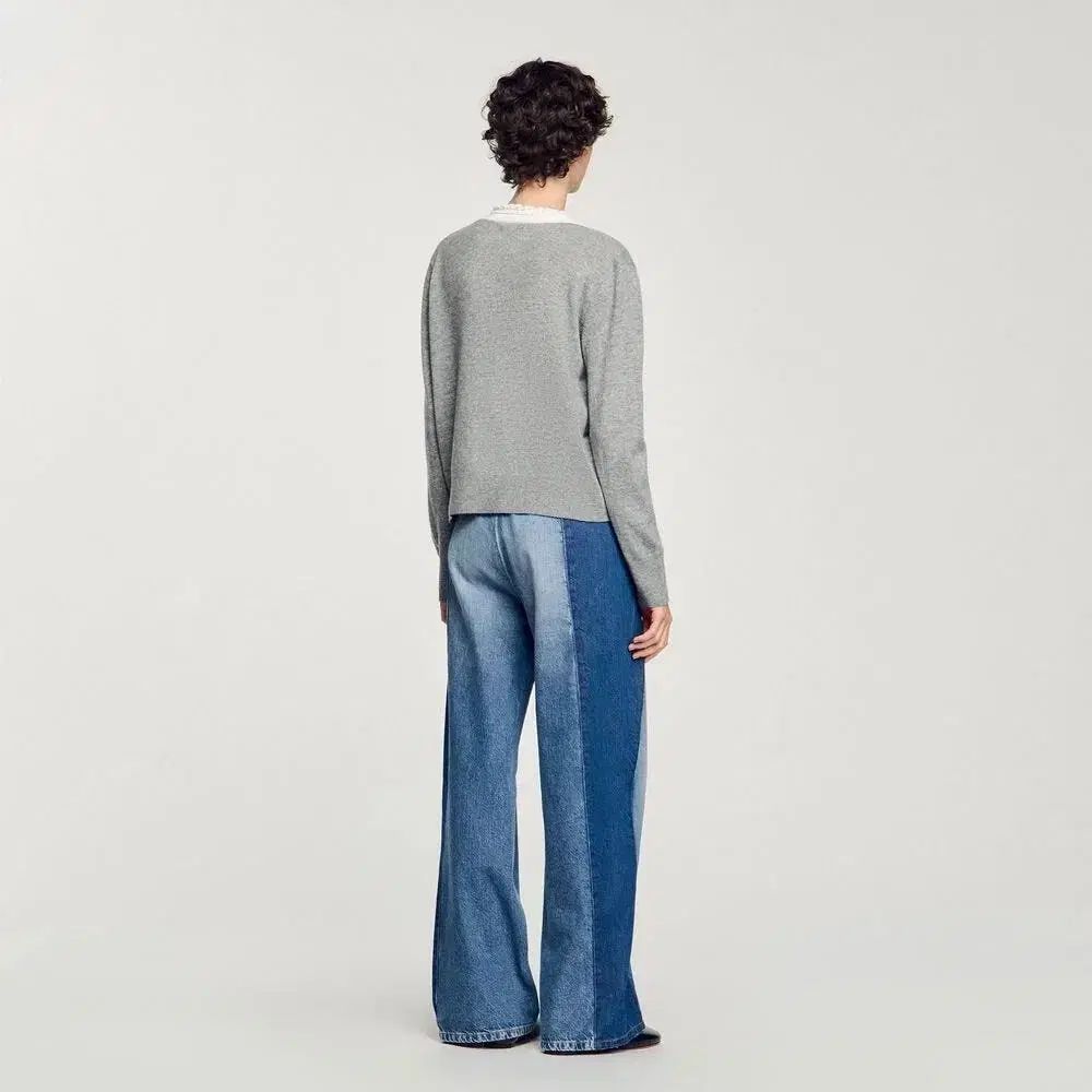 サンドロ25SS Vネックウール&カシミアニットセーター、グレーカラー。柔らかな肌触りと高級感のあるデザインが特徴です。119,000ウォン