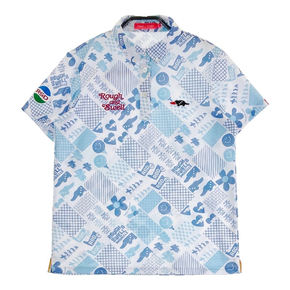 サイズ L ROUGH-SWELL ラフアンドスウェル モデル 半袖ポロシャツ ボタンダウン 総柄 ホワイト系 ゴルフウェア レディース ストスト
