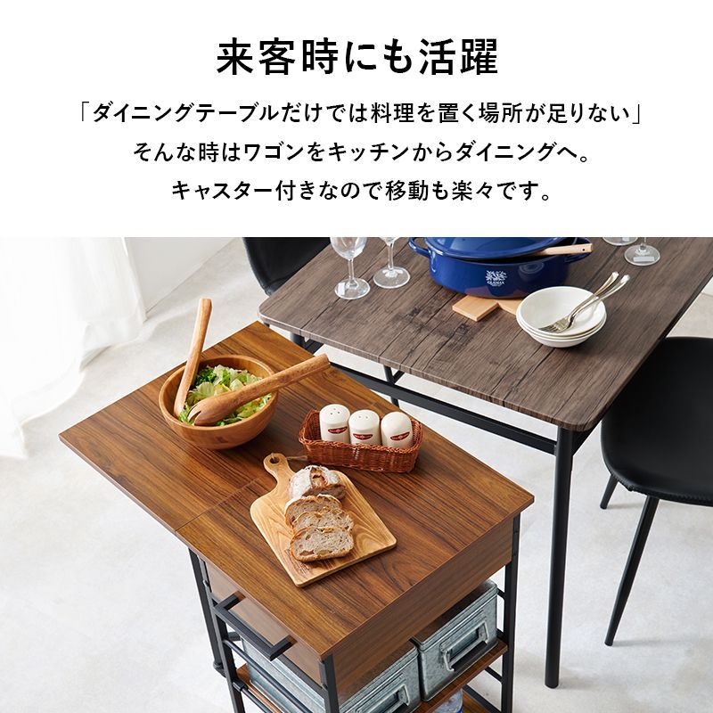 天板が広がるキッチンワゴン。作業スペースやテーブルの拡張に便利。カトラリーなどを収納できる引出付き