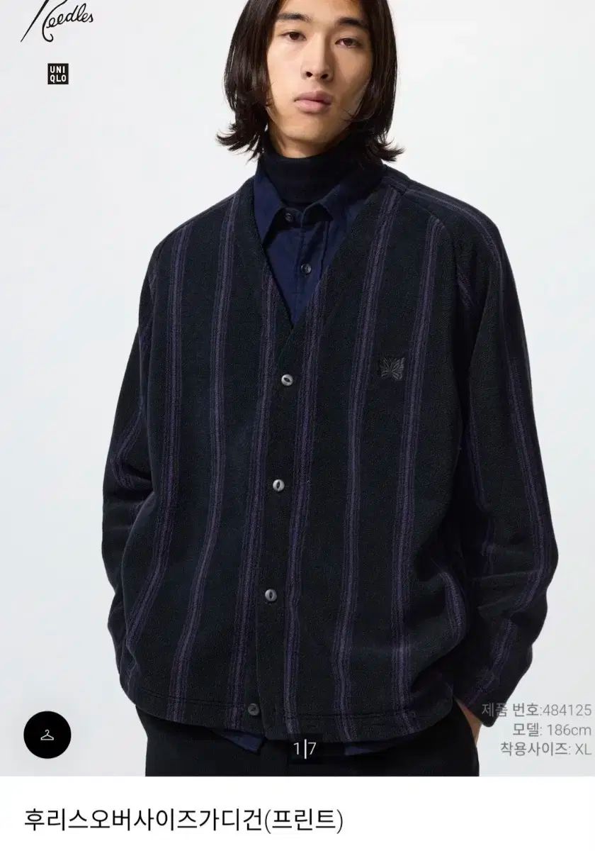 ユニクロ NEEDLES コラボ カーディガン Lサイズです。ブラックカラーに紫のストライプパターンが入っています。
