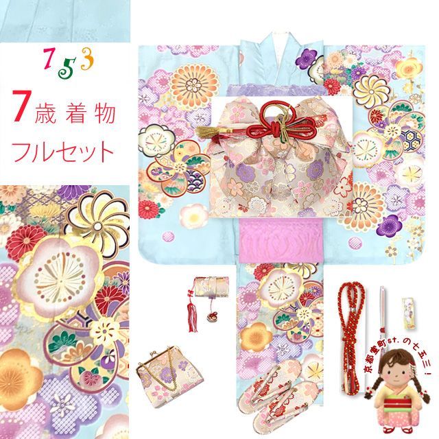 七五三 着物 7歳 オリジナルコーデセット 上質合繊 四つ身の着物と結び帯 フルセット 水色系 ねじり梅 TSRKsz Ei 27996 FP