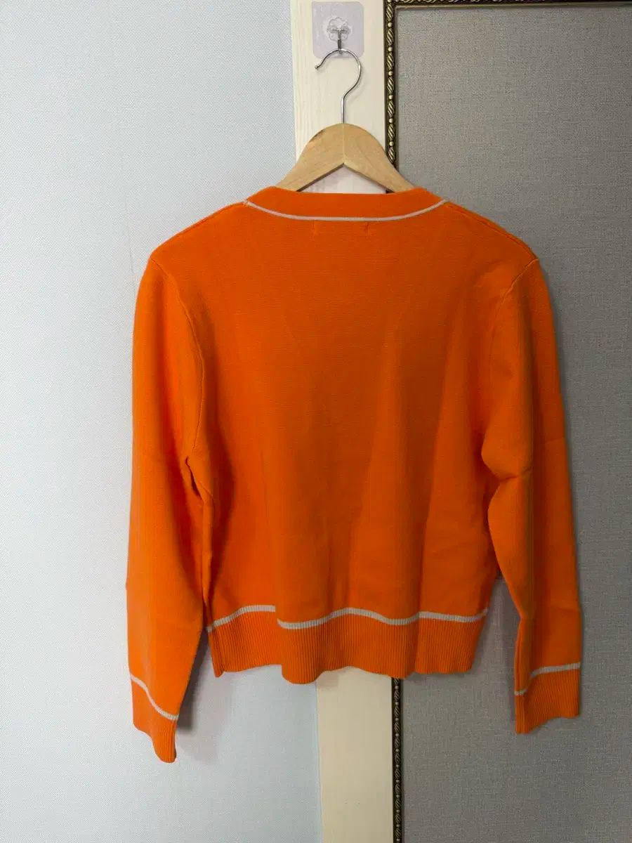 オレンジ色の女性用ゴルフカーディガン。実際の色の方が綺麗で素敵で、着やすいです