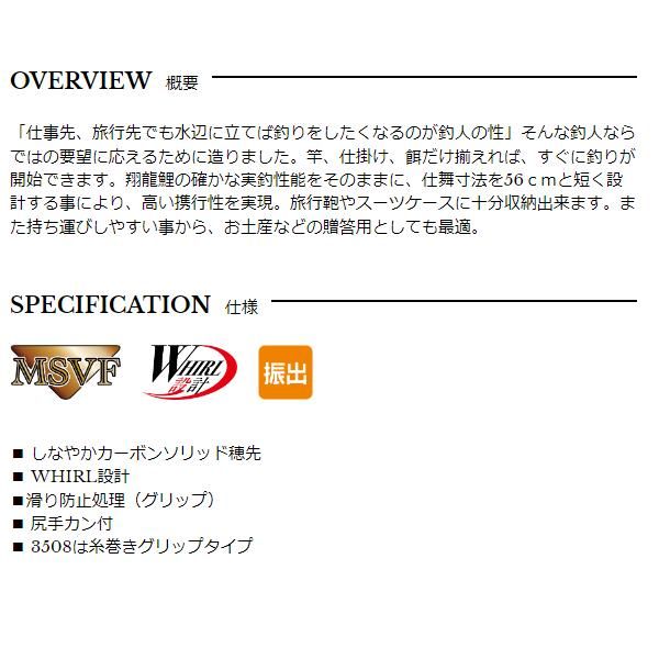 「仕事先、旅行先でも水辺に立てば釣りをしたくなるのが釣人の性」そんな釣人ならではの要望に応えるために造りました。竿、仕掛け、餌だけ揃えれば、すぐに釣りが開始できます。翔龍鯉の確かな実釣性能をそのままに、仕舞寸法を56cmと短く設計する事により、高い携行性を実現。旅行鞄やスーツケースに十分収納出来ます。また持ち運びしやすい事から、お土産などの贈答用としても最適。