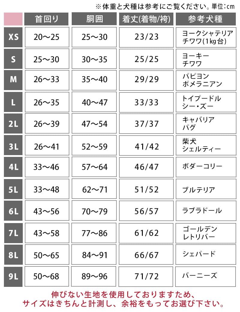 [XS]首回り20-25胸囲25-30背丈23 [S]首回り25-34胸囲30-37背丈25 [M]首回り26-35胸囲35-42背丈29 [L]首回り26-35胸囲40-47背丈33 [2L]首回り26-35胸囲46-62背丈37 [3L]首回り29-39胸囲52-62背丈41 [4L] 首回り33-43胸囲58-68背丈46 [5L]首回り38-48胸囲62-74背丈51 [6L]首回り41.5-51.5胸囲68-80背丈56 [7L]首回り43-53胸囲74-86背丈61 [8L]首回り50-65胸囲84-91背丈66 [9L]首回り50-68胸囲89-96背丈71