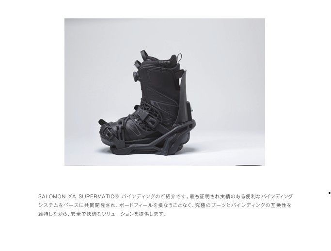 SALOMON XA SUPERMATIC バインディングは、ボードフィールを犠牲にすることなく、安全で快適なライディングを可能にする、最も実績のあるコンビニエンス・バインディング・テクノロジーを搭載。