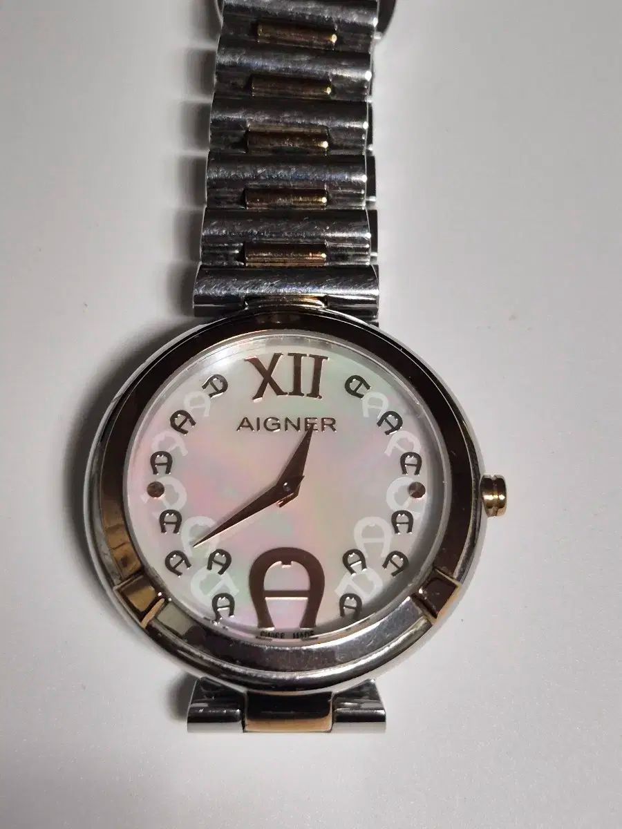これはアイグナーの女性用メタルウォッチです。シルバーメタルの時計にはアイグナーのロゴがあしらわれ、高級感を醸し出しています。シルバーと金の組み合わせなので、どんなコーデにも合います。別途ご不明な点がございましたら、すぐに安心してお支払いください!