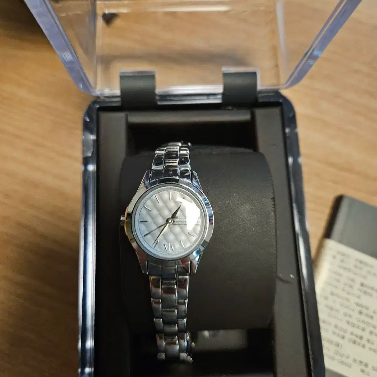 アルマーニの女性用メタルウォッチは新品です。時計にはエンボス加工が施されているので、高級感があります。オリジナルケースに入っているので、プレゼントにも最適です。