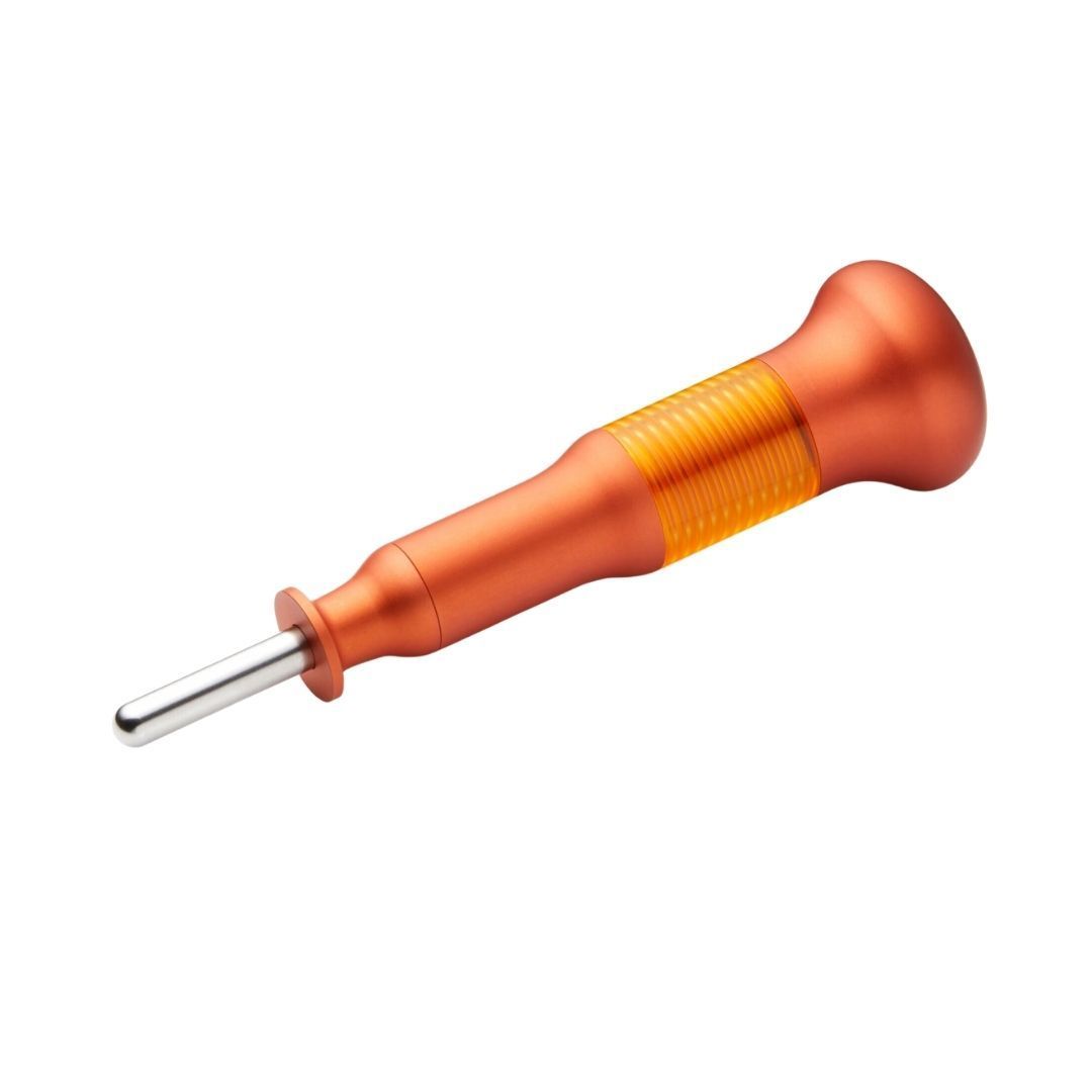 Body-Driverは、プラスドライバーのような形をしており、上下運動する1本のステンレス棒が組み込まれています。この棒をアプローチしたい筋肉にあて押し込むと、少しのひっかかりを感じたあと、さらに押し込むと、一気に奥から「揺れ響く」ような衝撃を筋肉に与えることができます。1~2秒間に1回程度のリズムで数回、アプローチしたい筋肉に圧を加えることで、奥から筋肉を緩める効果が期待できます。
