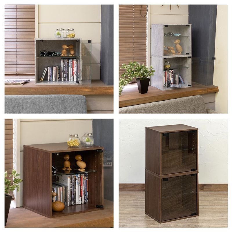 ガラス扉で中身が見えるキューブ型コレクション収納ケースです